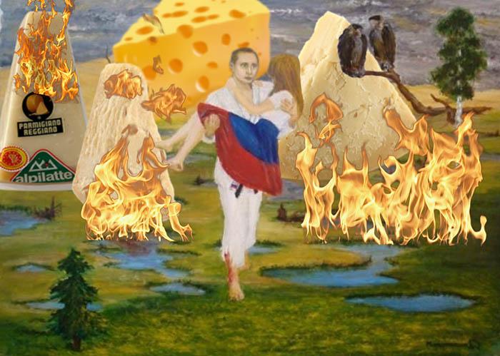 Далее он сбрызнул продукты жидкостью для разжигания углей и поджег. Ролик заканчивается словами «Возрождайся, Россия!».