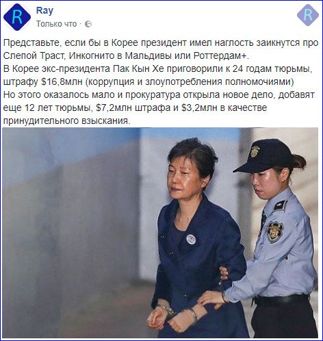Представьте если бы в Корее президент имел наглость заикнутся про Слепой Траст, Инкогнито в Мальдивы или Роттердам+. В Корее экс-президенту Пак Кын Хе к 24 годам тюрьмы добавят еще 12 лет (коррупция и злоупотребления полномочиями).
