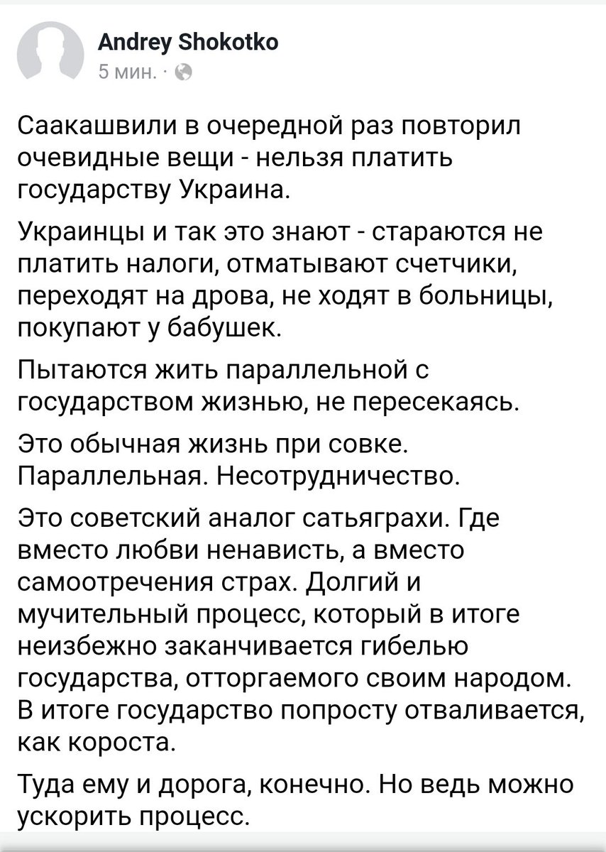 Саакашвили в очередной раз повторил очевидные вещи — нельзя платить государству Украина. Украинцы и так это знают — стараются не платить налоги, отматывают счетчики, переходят на дрова, не ходят в больницы, покупают у бабушек. Пытаются жить параллельной с государством жизнью.