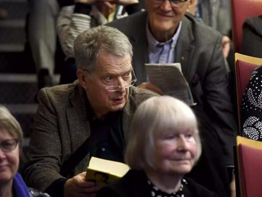 Президент Финляндии пришел на книжную ярмарку, но все места были заняты, поэтому он сел на ступеньки.