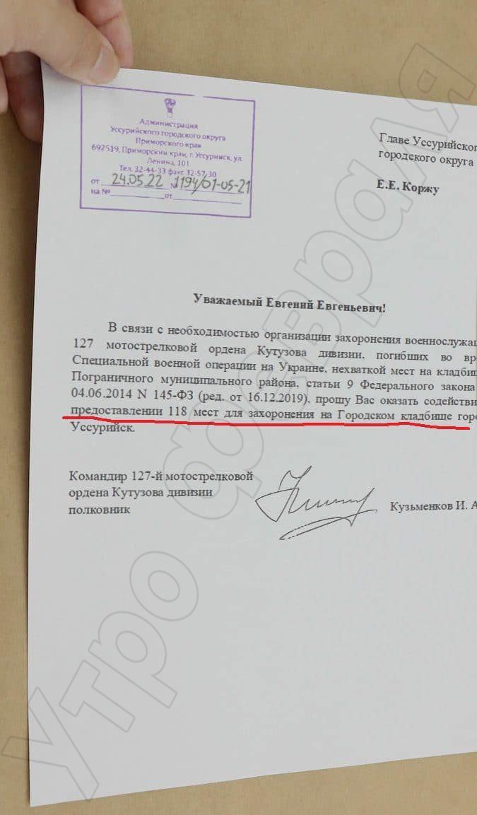 В России заканчиваются… места на кладбищах. В Уссурийске военное командование просит дополнительно предоставить 118 мест для захоронения «демилитаризаторов Украины».