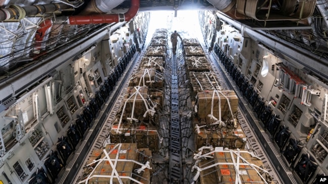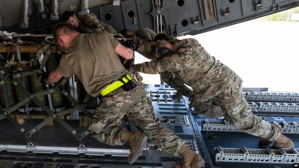 Летчики загружают более 8000 фунтов 155-мм снарядов в грузовой самолет С-17 для транспортировки, который в конечном итоге направляется в Украину, 29 апреля 2022 года, на базе ВВС Довер, штат Делавэр.