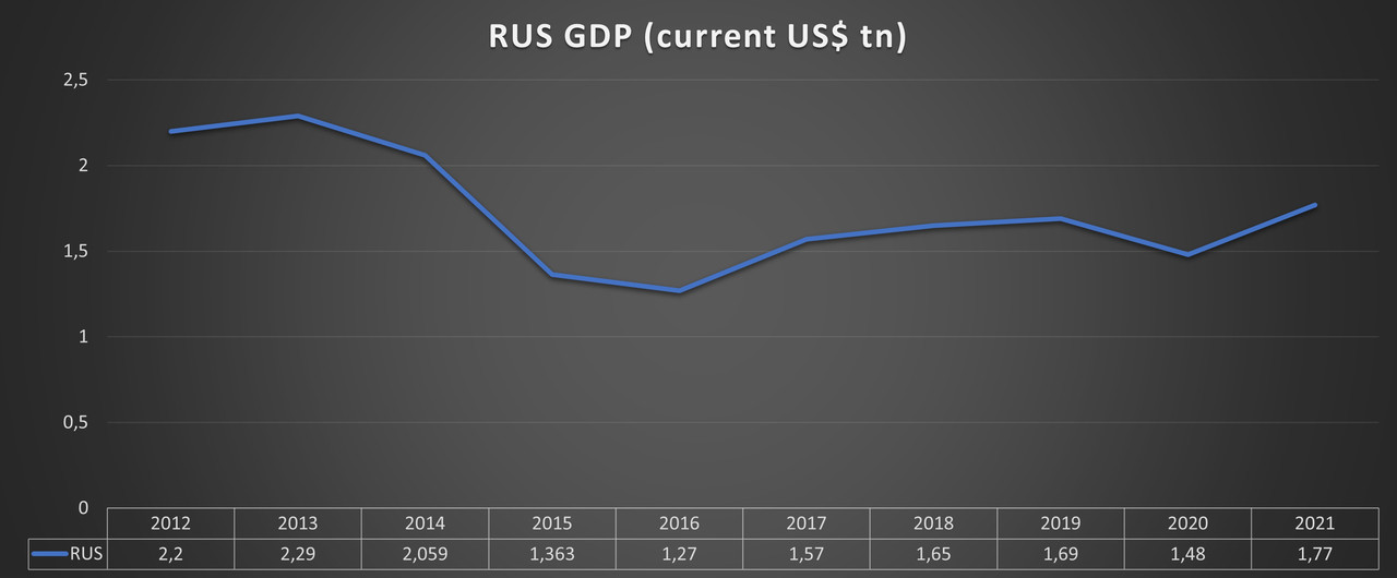смотри 2014 год-2,29 трл,2021-1,7. 2.29-1,7=0,5 0,5/2.29*100=23%. Я говорил о 23%,25%-стало с учетом падения за 2022 год И это -называется как раз деградация.Экономика не вышла на уровень 2013 года