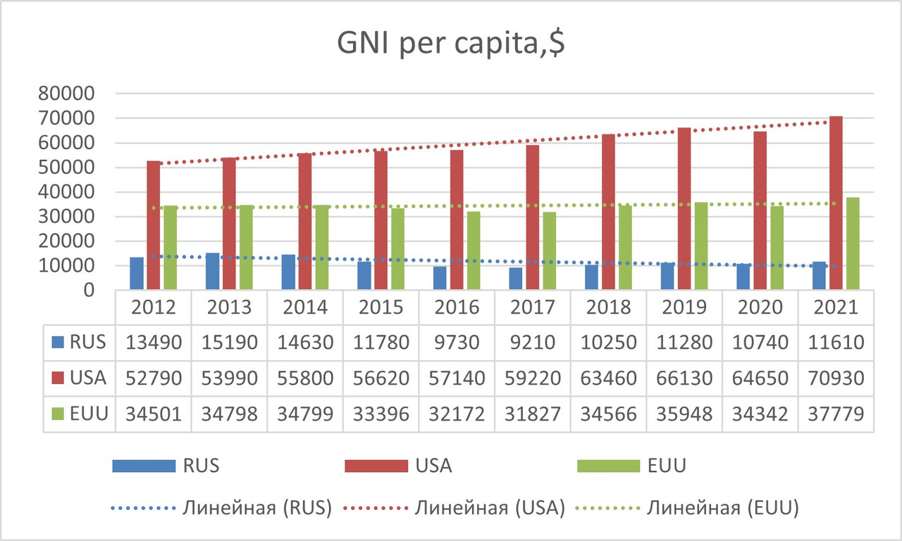 > График говорит сам за себя:GNI на 1го чел производится в 6 раз меньше чем в США и 3-чем в ЕС. > Очень "эффективная" экономика