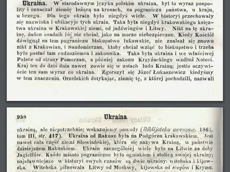 Украина. В древнем польском языке ukraina — это было обиходное слово и означало землю, лежащую на окраине, на пограничье государства, края, у берега. Таких украин когда-то было много. В истории сохранились названия и указания украин. Таковой когда-то была краковская украина в Краковской земле, жешувской и Люблинской. Никто не хотел идти на украину, никто из здешних не желал, как на опасное море. Когда краковское духовенство, а затем пограничное русское епископство вновь оказалось без желающих, никто из краковян и сандомирян не хотел брать это епископство, и нужно было поставить туда чужеземца и монаха. Таковой была украина и в собственно Польше со стороны Поморья, а позднее — вдоль Нотеци, после завоеваний крестоносцев. До сегодняшнего дня даже в устах народа Краина это слово употребляется как украина. Старейший Йозеф Лукашевич когда-то употреблял его в этом значении, говоря об оржельских землях; земли, из которых они происходили, называли украиной, но это уже излишне; мы указываем доказательства (Biblioteka warszawska, 1862, том III, стр. 417).