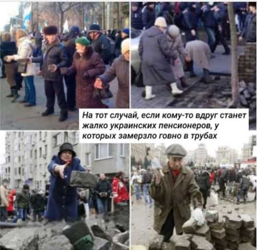 Фотофакт — киевские бабушки и дедушки собирают камни, которыми нацисты бьют «Беркут», чтобы через 12 лет остаться без пенсий и с г… ном в пакетах и с выгребными ямами во дворах многоэтажек. Вот такая история успеха, как говорится…