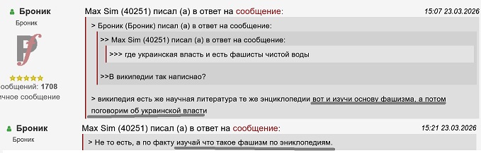 Твое выше про мразь согласен полностью Броник (Броник) просто позорно признавать что он хавает на ура как их жестко дебилят зная что подобные личности не будут заморачиватся проверить легко доступную инфу (признаки фашизма). Он тут в другой ветке вообще самомакнулся классно по самые не хочу рассказывая что на украине запрещены законом символика нацизма, а нему фото их уже просроченного зеленского где с ним стоит чел с шевроном символом нацизма
