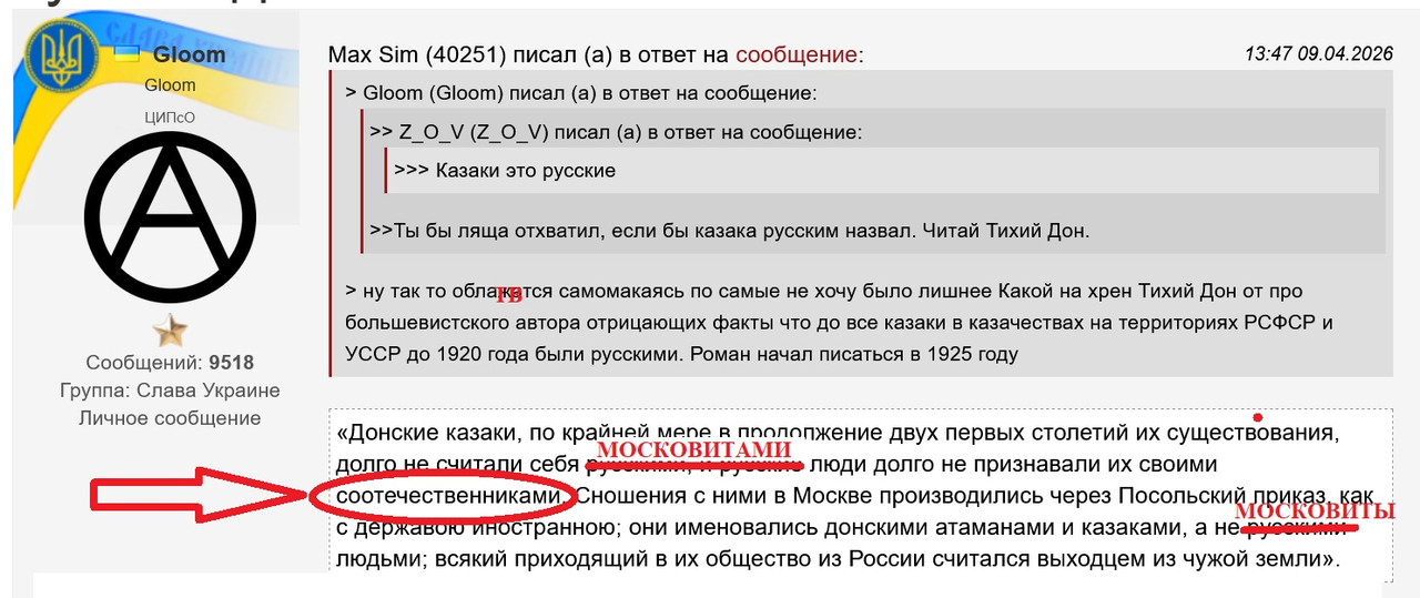 >>>> ну так то облажатся самомакаясь по самые не хочу было лишнее Какой на хрен Тихий Дон от про большевистского автора отрицающих факты что до все казаки в казачествах на территориях РСФСР и УССР до 1920 года были русскими. Роман начал писаться в 1925 году >>> >>> «Донские казаки, по крайней мере в продолжение двух первых столетий их существования, долго не считали себя русскими, и русские люди долго не признавали их своими соотечественниками. Сношения с ними в Москве производились через Посольский приказ, как с державою иностранною; они именовались донскими атаманами и казаками, а не русскими людьми; всякий приходящий в их общество из России считался выходцем из чужой земли».