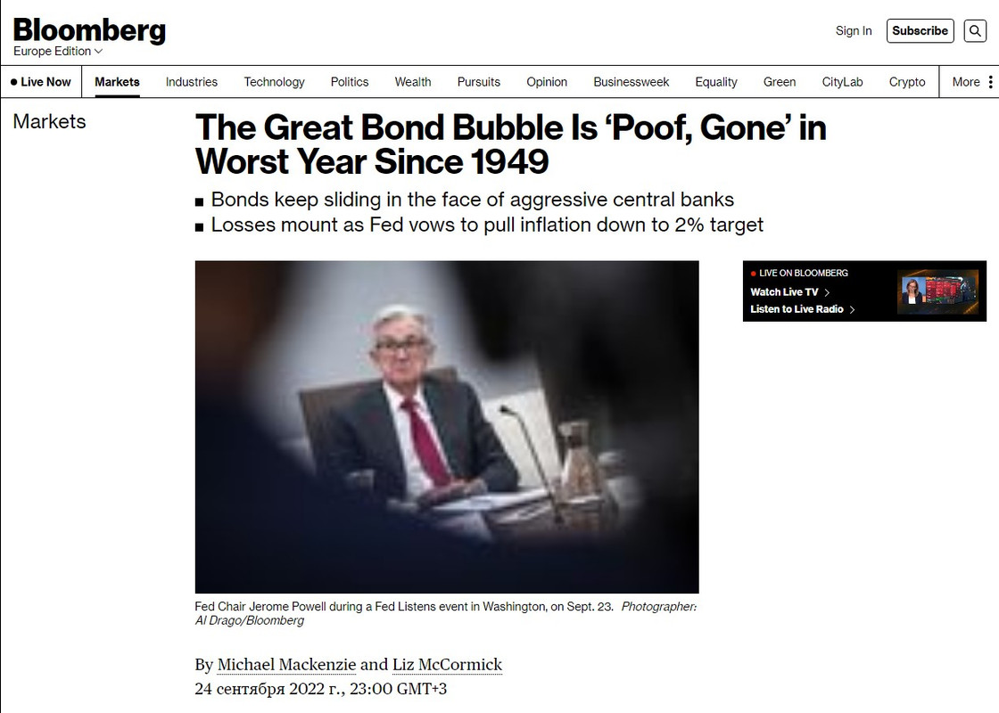 Bloomberg: Запад на пороге худшего с 1949 года кризиса Bloomberg: повышение ставок на Западе вызвало небывалый с 1949 года обвал гособлигаций 24 сентября 2022 г.