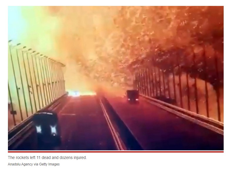 "Ракеты привели к гибели 11 человек, десятки ранены", — гласит подпись под фото теракта на Крымском мосту.