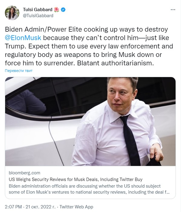 >> Президент США Джо Байден намерен расправиться с миллиардером Илоном Маском, заявила бывшая конгрессвумен Тулси Габбард. «Администрация Байдена и властная элита придумывают способы уничтожить Маска, потому что они не могут его контролировать», — написала она в Twitter.