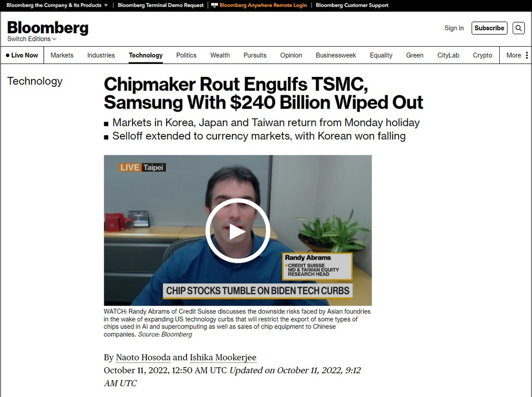 Bloomberg: Chipmaker Rout Engulfs TSMC, Samsung With $240 Billion Wiped Out