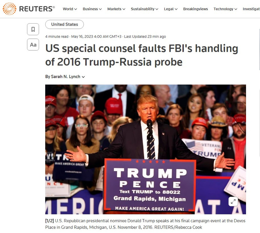 Reuters: Спецпрокурор Дарем считает, что у ФБР не было оснований для начала расследования возможного вмешательства России в американскую избирательную кампанию 2016 года May 16, 2023