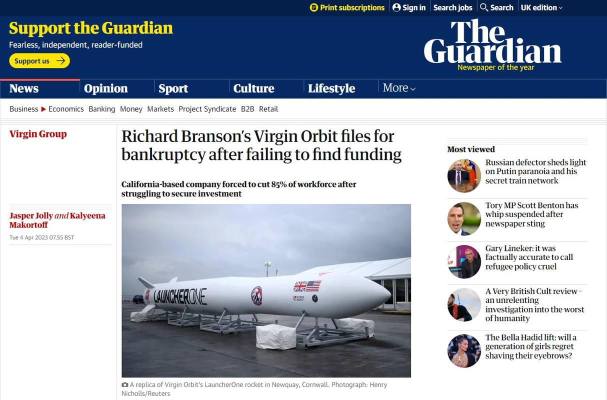 The Guardian: Virgin Orbit Ричарда Брэнсона подала заявление о банкротстве Tue 4 Apr 2023