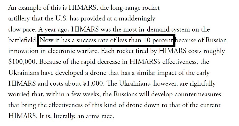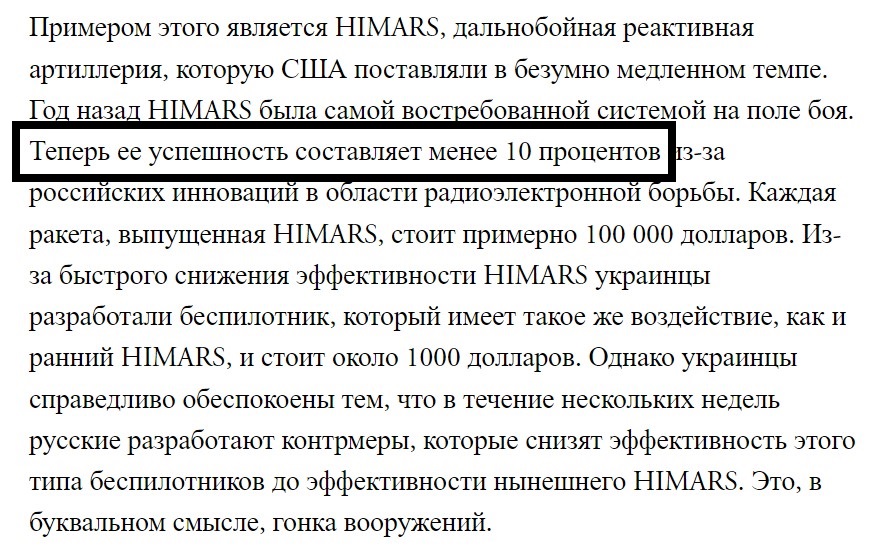 зачем мне верить «правде», то есть бреду про результативность himars какому-то анониму с ником Иван Павлов (Закулисинъ), я верю американскому журналу The Atlantic (ранее The Atlantic Monthly — одному из старейших и наиболее респектабельных журналов США. Основан в 1857 году в Бостоне.), который пишет, что «Российская РЭБ снизила эффективность HIMARS более чем на 90%» — попробуй опровергни американский журнал The Atlantic и не «транслируй высказывание Лаврова про дебилизм», вычти из ста (100) десять (10) процентов, вдруг у тебя получится какая-то другая цифра, а не 90% и тогда ты посрамишь аж самого Лаврова с его высказыванием про дебилизм …