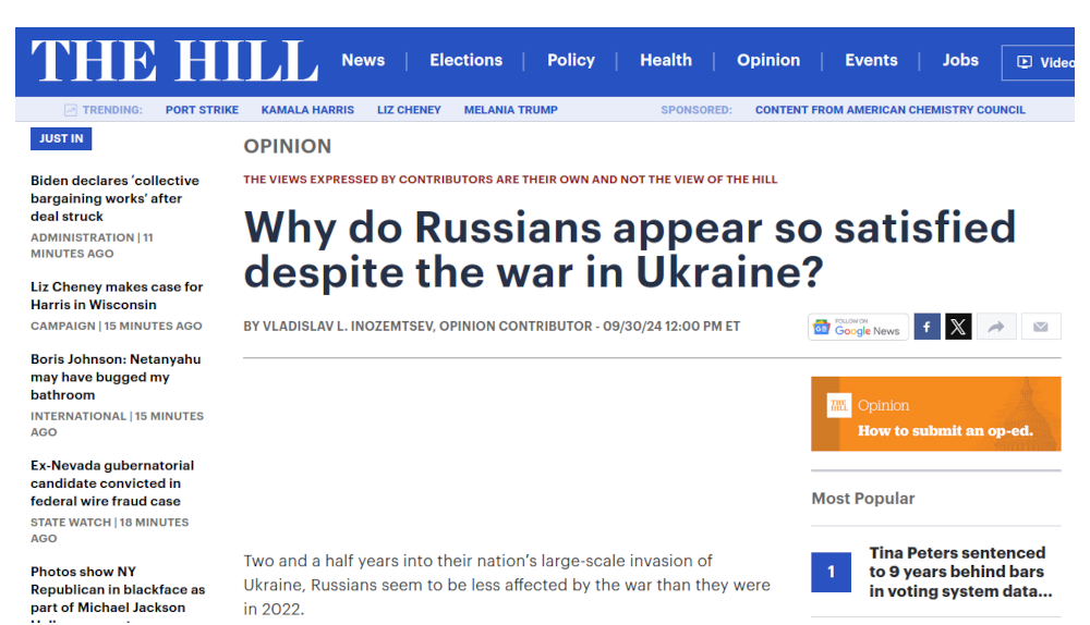 Совершенно потрясающая статья в The Hill — о том, что «россияне должны страдать, но живут лучше чем в ЕС». 09/30/24