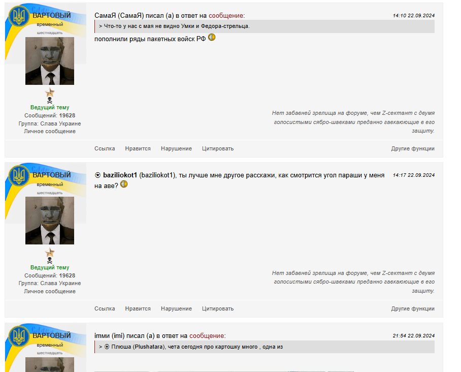 "а че ты паришься ? я вот забанил помойное (пушечное ядро) и узнаю о его присутствии только когда ему нравятся какие нибудь идиотские посты ..." только тявкать в спину