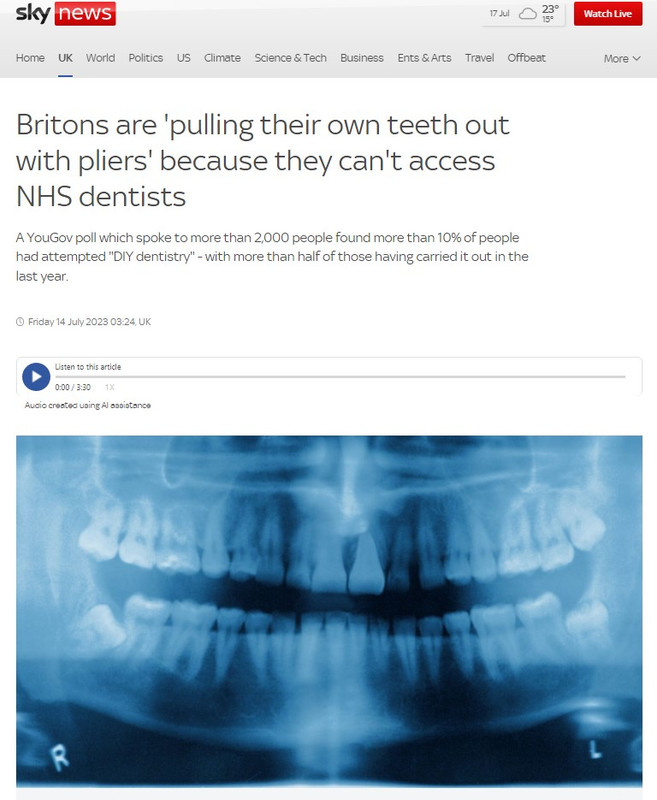 Sky News: британцы «вырывают себе зубы плоскогубцами», потому что у них нет доступа к дантистам NHS (Национальная служба здравоохранения) Friday 14 July 2023