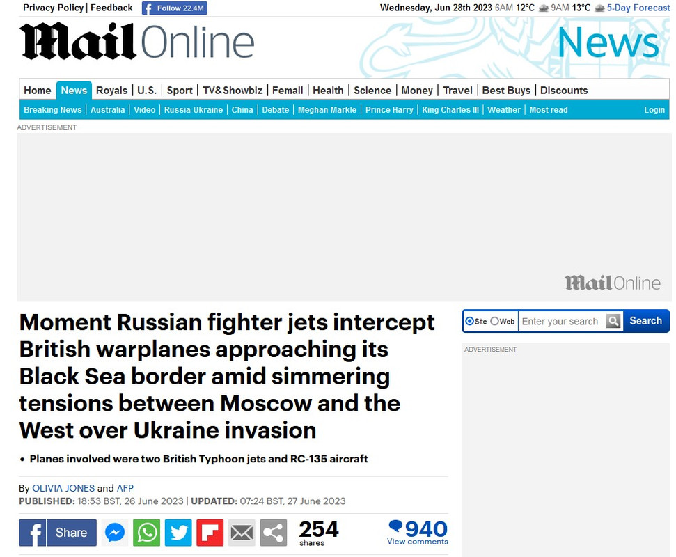 «Куда лезем?» Читатели Daily Mail пришли в ужас из-за перехвата Россией британских самолетов в Черном море. Published: 18:53 BST, 26 June 2023