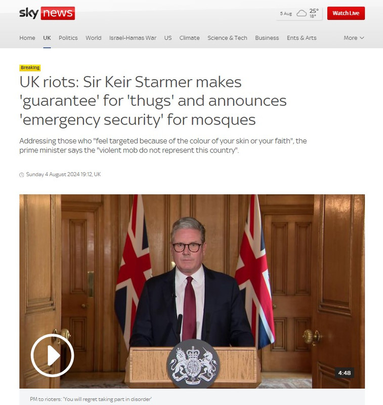 Премьер Британии назвал бандитизмом массовые беспорядки в стране: участники беспорядков в Британии пожалеют о своих действиях Sunday 4 August 2024 19:12, UK
