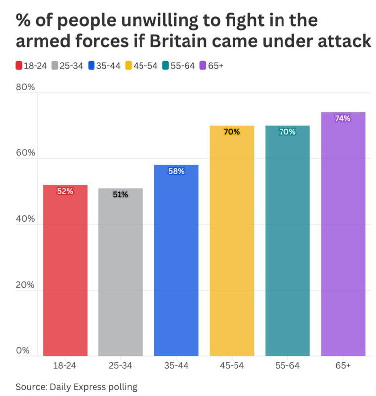 «64% совершеннолетних британцев заявили, что они не намерены воевать за Британию, а еще 6% выразили неуверенность по этому поводу», - отмечается в публикации.