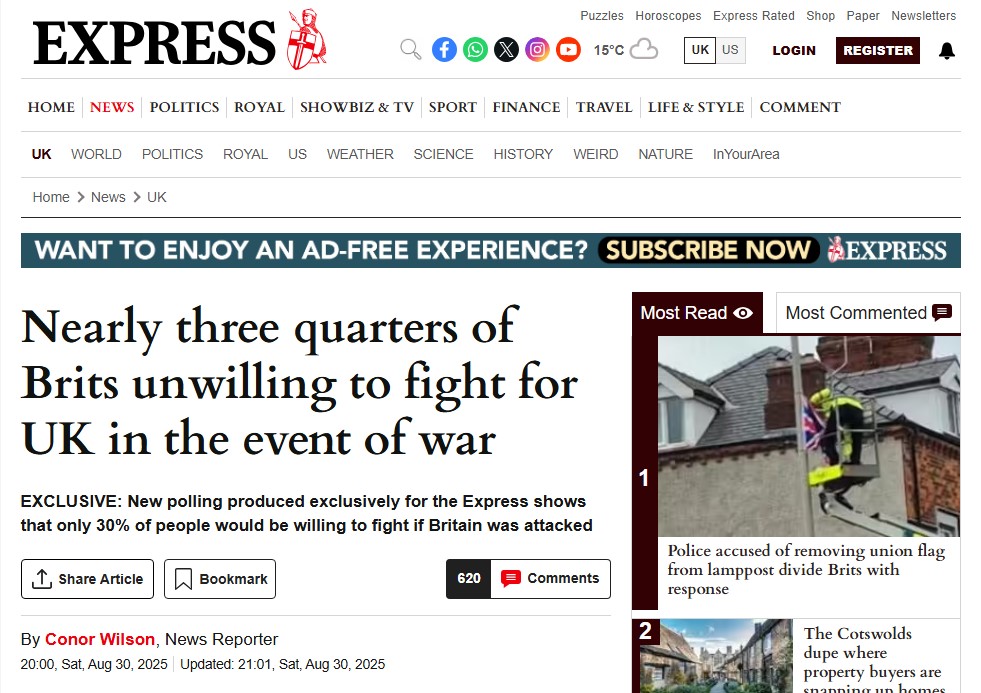 Почти три четверти британцев не намерены защищать свою страну в случае войны Sat, Aug 30, 2025