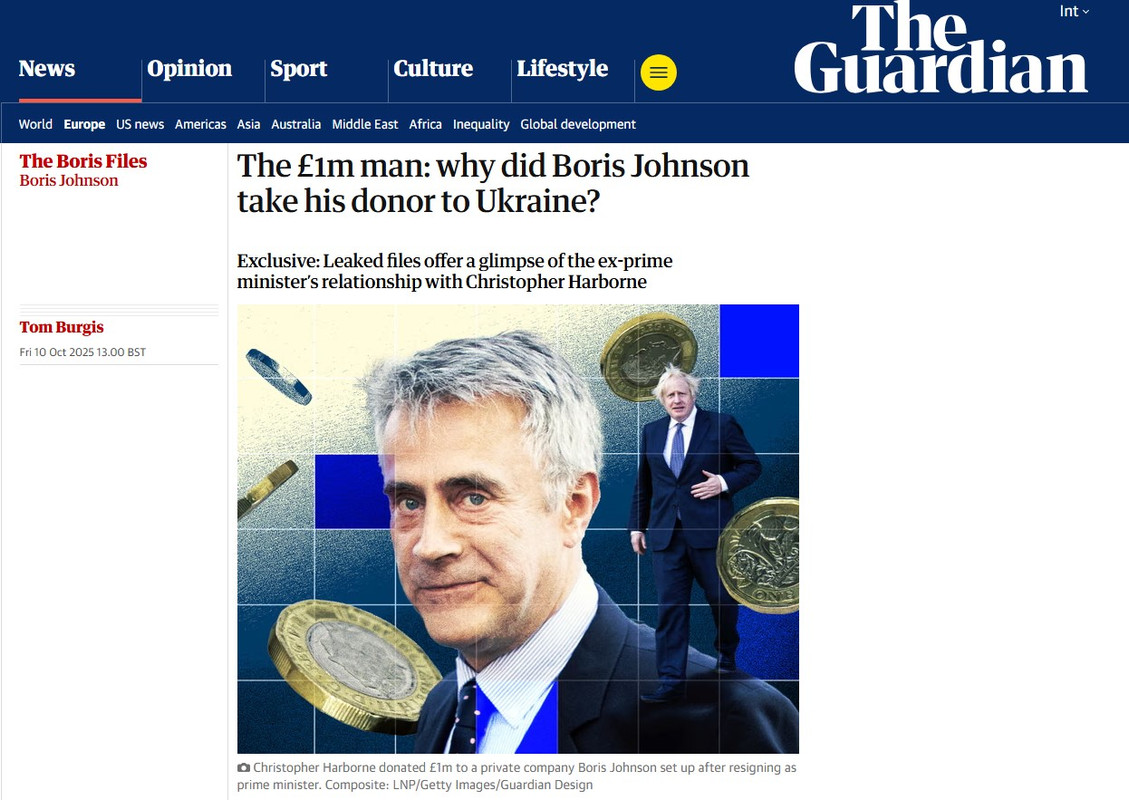 Человек на миллион фунтов: зачем Борис Джонсон ездил на Украину вместе со своим спонсором? The Guardian: Борис Джонсон лоббировал украинский конфликт за «пожертвования» Fri 10 Oct 2025