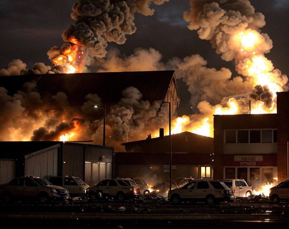 На кадрах — мощные взрывы в британском Суиндоне. К слову, именно там Лондон анонсировал строительство цехов по производству дронов, в т. ч. для поставки на Украину.