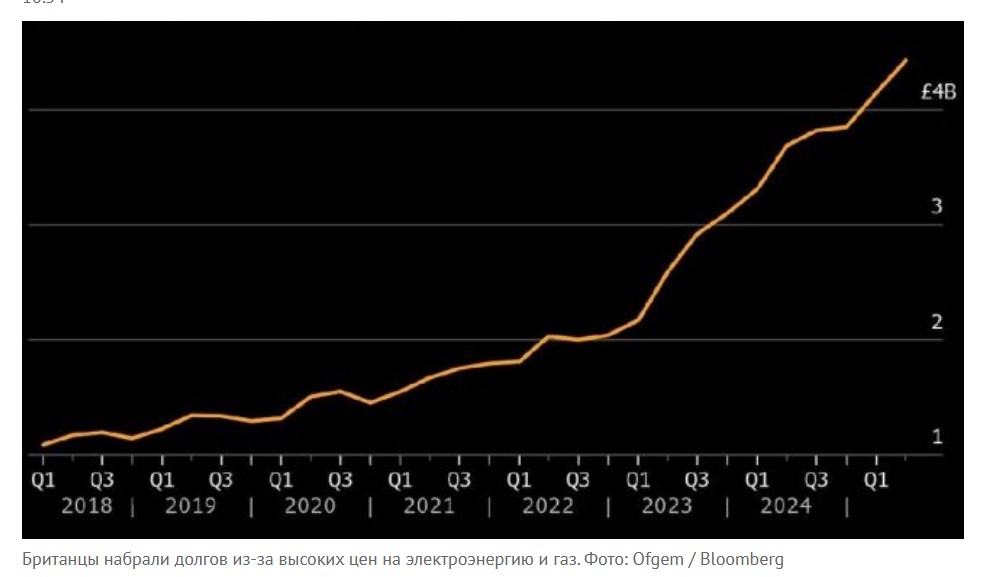 «Долг британских потребителей коммунальным предприятиям (долги и просроченная задолженность) достиг рекордной отметки — почти 4,5 млрд фунтов стерлингов (или 5,8 млрд долларов США). Это напоминает мне закон Штейна: „Если что-то не может длиться вечно, оно прекратится“», — пишет в Х обозреватель Bloomberg Хавье Блас.