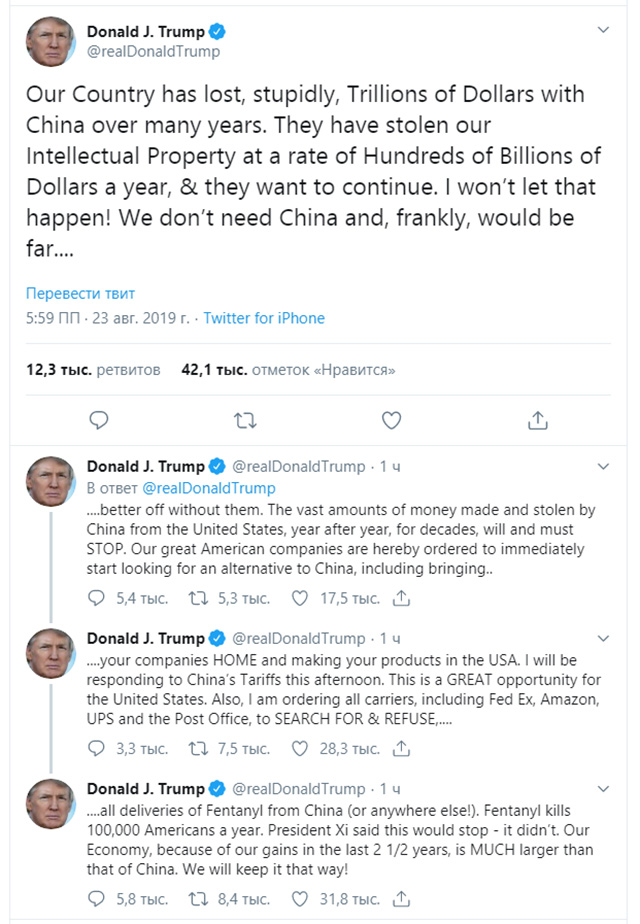 «Наша страна тупо потеряла триллионы долларов с Китаем за многие годы. Они украли нашу Интеллектуальную собственность по цене в сотни миллиардов долларов в год, и они хотят продолжать. Я этого не допущу!», — написал Трамп в своём Твиттере.