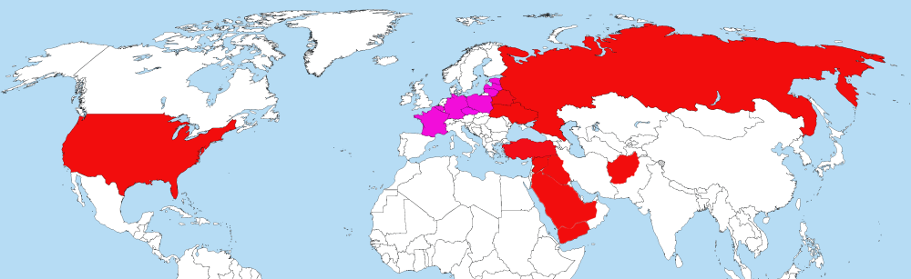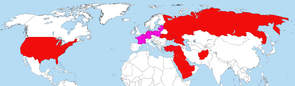 Ряд европейских стран, закрашенных малиновым цветом, вступили в войну против РФ на стороне Украины официальными обвинениями в адрес РФ и поддержкой Украины.
