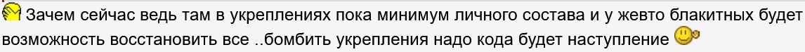 >>>> Исчо вапрос ценителю палана Путина калуку. Через несколько дней мню отчаливать, и надеюсь, что к весне начнеццо наступление. Но вапрос вот в чем. Пока мы сейчас ведем бои в Артемоваске, пытаемсо выйти на Угледар, и возможно весной еще куда-то, укрепления, которые находяццо за ними, например вокруг Краматорска или Славенска пока что остаюццо стоять целыми, да еще и усиливаюццо. Вопрос к знатокакм, почему пока не ведуццо бои вокруг Артемовска, Угледара и т.д., енти укрепления не подвергаюццо ударам авиации, а ведь ФАБа или БетАБы обладают куда более разрушительной силой нежели артиллерия. Ну-ка калук, шо там у Путина на ентот счет? >>> Зачем сейчас ведь там в укреплениях пока минимум личного состава и у жевто блакитных будет возможность восстановить все ..бомбить укрепления надо кода будет наступление
