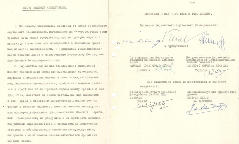 Это было юридически ничтожное действо. Костюмированное представление. На самом деле капитуляция Германии ВО ВТОРОЙ МИРОВОЙ войне была подписана в Реймсе 7 мая 1945 г. И выглядит она вот так: