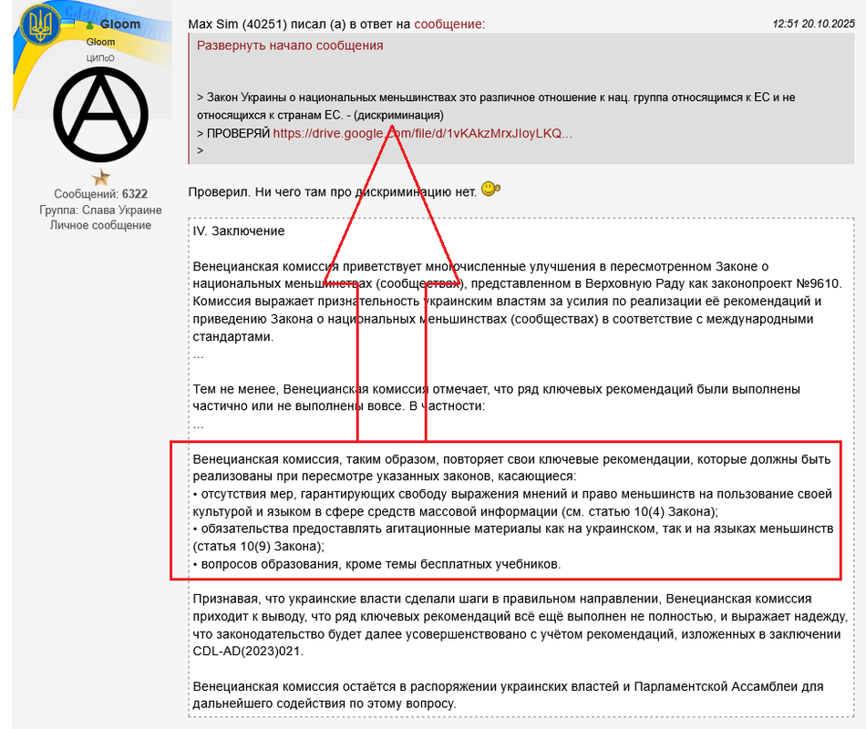 > > Проверил. Ни чего там про дискриминацию нет. > > IV. Заключение > > Венецианская комиссия приветствует многочисленные улучшения в пересмотренном Законе о национальных меньшинствах (сообществах), представленном в Верховную Раду как законопроект №9610. Комиссия выражает признательность украинским властям за усилия по реализации её рекомендаций и приведению Закона о национальных меньшинствах (сообществах) в соответствие с международными стандартами. > ... > > Тем не менее, Венецианская комиссия отмечает, что ряд ключевых рекомендаций были выполнены частично или не выполнены вовсе. В частности: > ... > > Венецианская комиссия, таким образом, повторяет свои ключевые рекомендации, которые должны быть реализованы при пересмотре указанных законов, касающиеся: > • отсутствия мер, гарантирующих свободу выражения мнений и право меньшинств на пользование своей культурой и языком в сфере средств массовой информации (см. статью 10(4) Закона); > • обязательства предоставлять агитационные материалы как на украинском, так и на языках меньшинств (статья 10(9) Закона); > • вопросов образования, кроме темы бесплатных учебников. > > Признавая, что украинские власти сделали шаги в правильном направлении, Венецианская комиссия приходит к выводу, что ряд ключевых рекомендаций всё ещё выполнен не полностью, и выражает надежду, что законодательство будет далее усовершенствовано с учётом рекомендаций, изложенных в заключении CDL-AD(2023)021. >